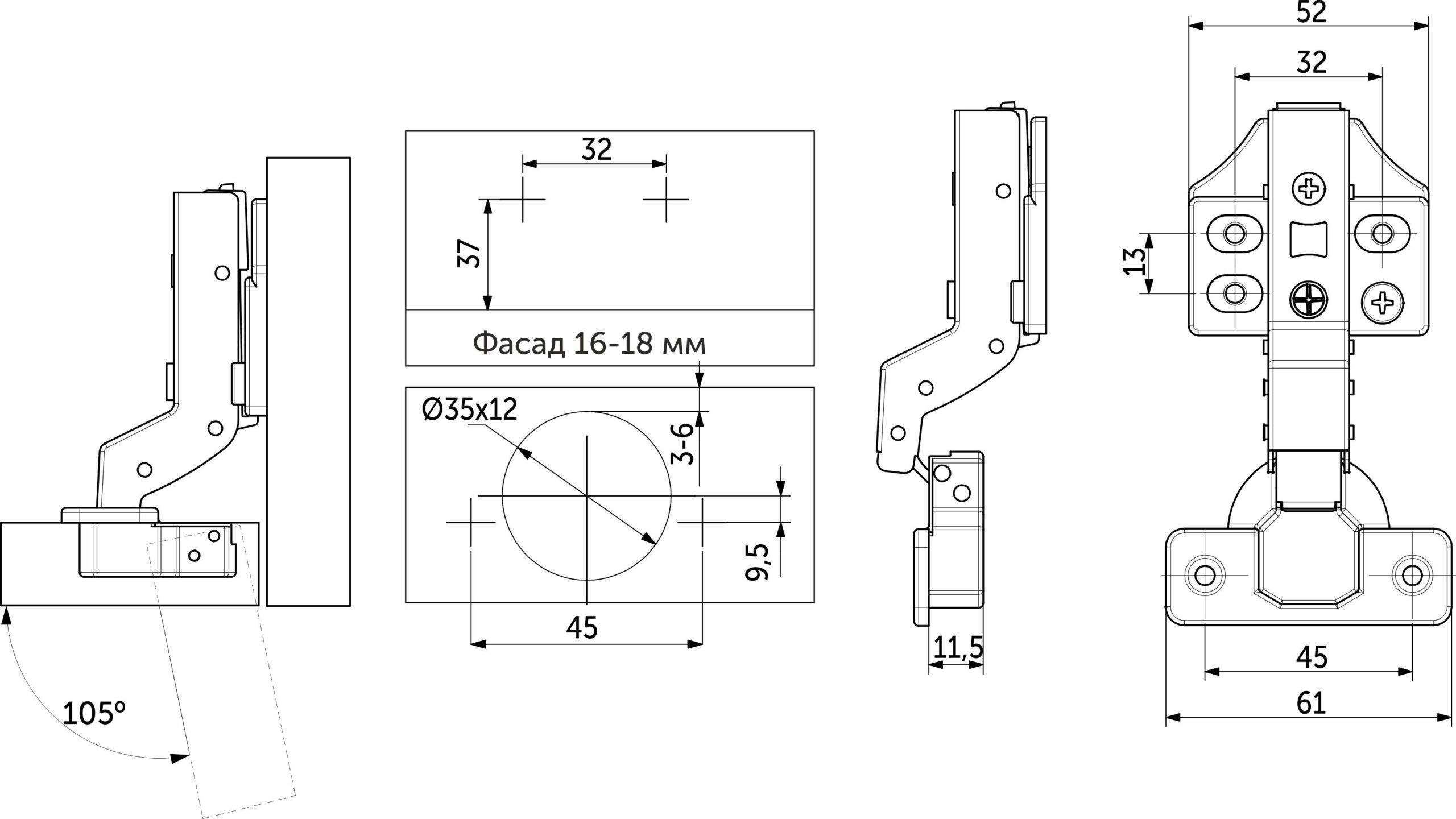 Данная петля подходит для фасадов толщиной до 22мм.
