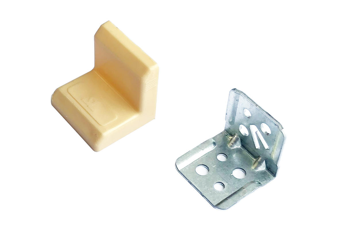 Стальной соединительный уголок для мебели с декоративной пластиковой накладкой различных цветов.