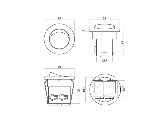 Выключатель D23 встраиваемый IP20, 6A, 250B (23х23х19,5 мм), с пружинным терминалом, белый — механическое устройство кнопочного типа, используемое для включения и выключения осветительных приборов. Выключатель встраивается в мебельное изделие из древесных плит, в предварительно сделанное отверстие соответствующего диаметра (20,2 мм).