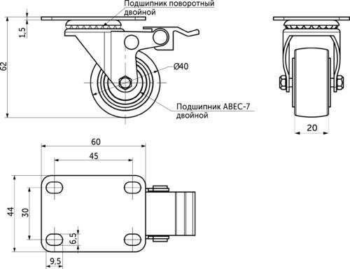 Для данного колеса подобрана специальная комбинация материалов (PP+PVC) для износостойкости и бесшумного движения, эксплуатации без повреждений напольного покрытия (следов и царапин).