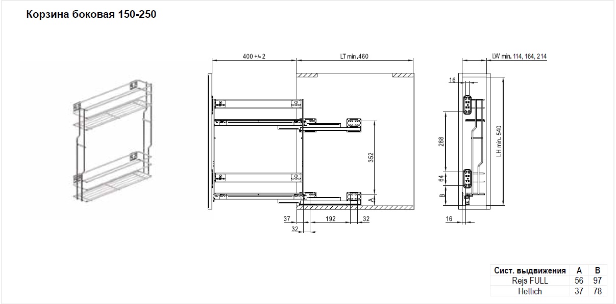 Корзина в корпус 150, 200, 250 с боковым креплением. Корзина универсальная, сторона крепления зависит от направляющих. Поставляется в трех основных покрытиях: хром, оцинк, графит.