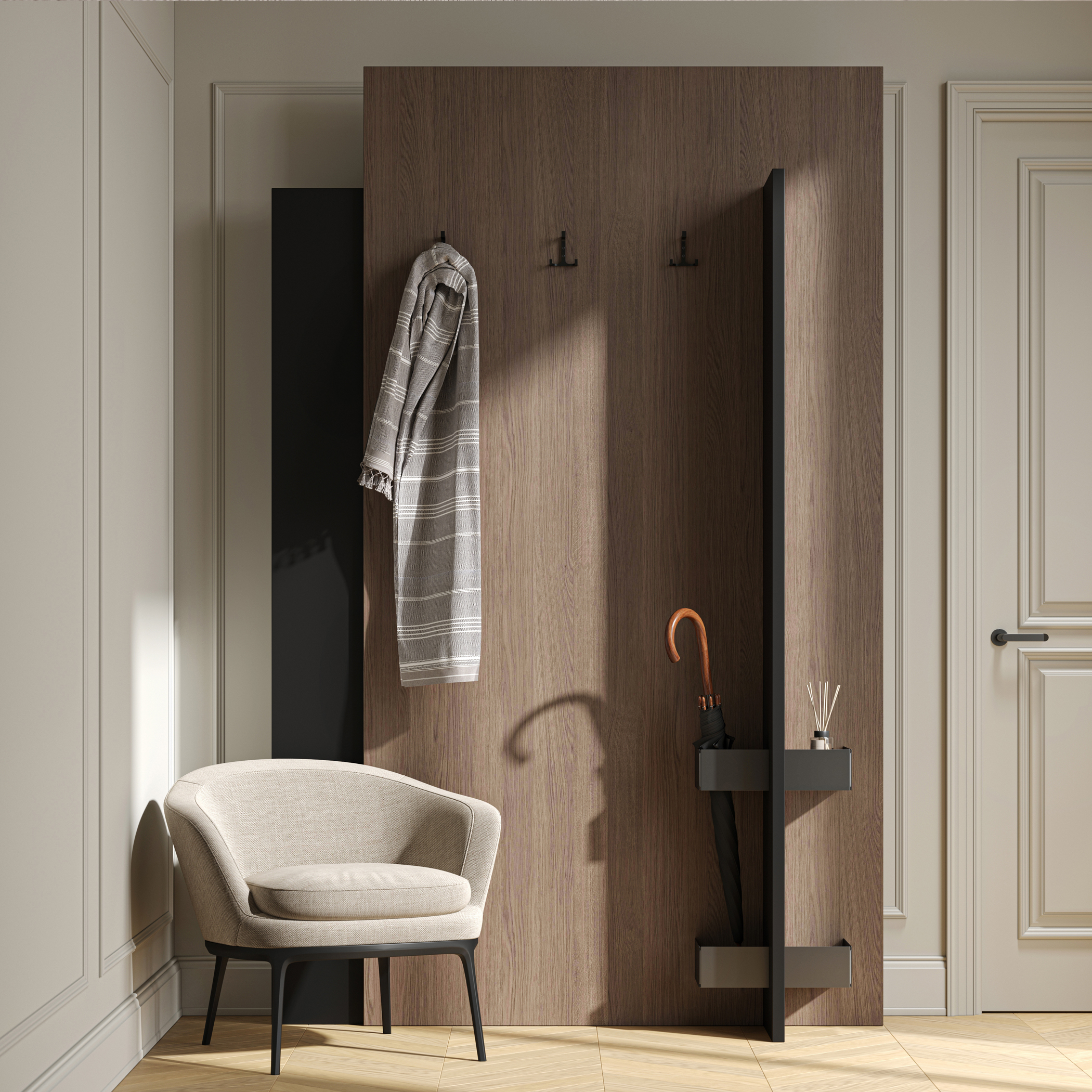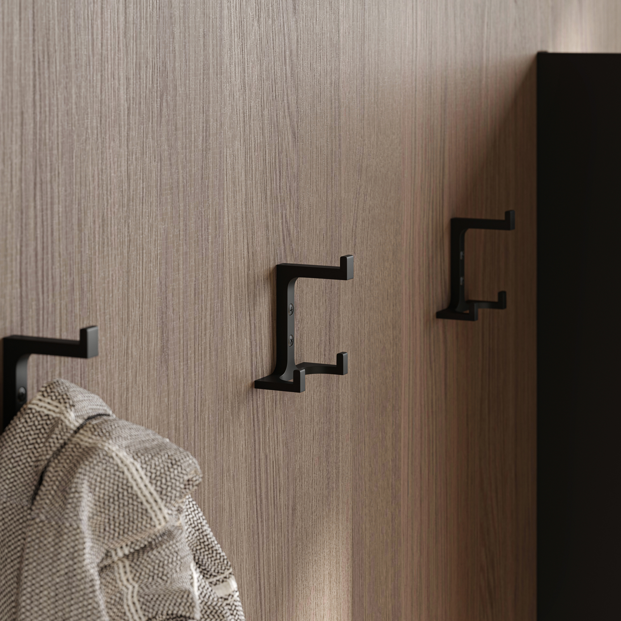 Трехрожковый металлический настенный крючок это компактное и удобное решение для организации хранения вашей одежды или других предметов в доме. Цвет матовый черный. Материал - цинк-алюминий. Крючок мо...