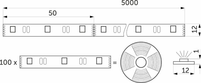 Тип диодов 5050, количество диодов 300, степень защиты IP20, мощность 10W/m, напряжение 12V, ширина 12 мм, цветная — 5м.