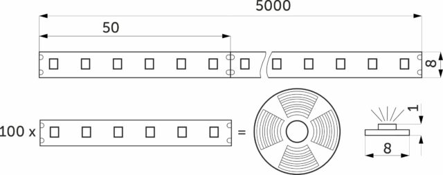 Лента светодиодная - 9,6W/m, 24V, 8мм, 2835, 120 д/м, IP20, теплый белый (3000K) - 5м, AKS 115308