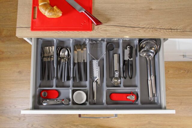 Лотки для столовых приборов цвете белом и сером из гладкого пластика с блеском в цвете графит из пластика структурированного для выкатных ящиков глубиной 450 мм для ширины корпуса 300-900 мм с возможн...
