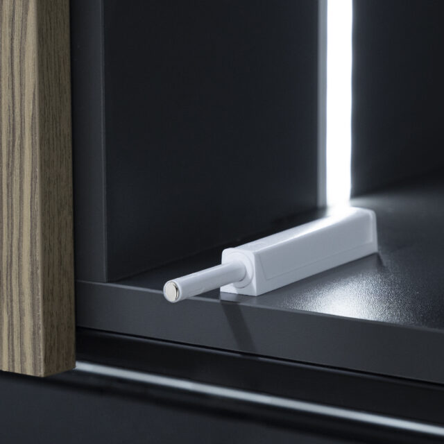 Толкатель с магнитным наконечником под фасады без ручек, устанавливается с петлями без пружин или с пружинами обратного действия. Позволяет оттолкнуть фасад на 35-40 мм для дальнейшего открытия. Монтаж в переднюю кромку каркаса или на держателях внутри корпуса (т.е. как врезной, так и в корпусе как накладной). В комплекте присутствует ответная планка стальная. Так же присутствует система регулировки зазора между фасадом и корпусом в закрытом состоянии на + 5 мм. Подходит для тяжелых фасадов.