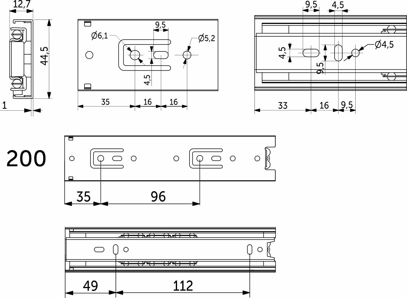 Классическая направляющая с шарикоподшипниковым механизмом и телескопической структурой, обеспечивает полное выдвижение. Высота 45 мм . Изготовлена из холоднокатаной стали. Длина -200 мм. Резиновый фиксатор от самопроизвольного открытия. Нагрузка -35 кг, Толщины 1,0*1,0*1,2 ( запас прочности — 80000 циклов).