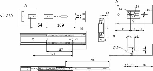 Представлены в широком диапазоне длин: от 250 до 600 мм (с шагом 50 мм), с полным выдвижением, начиная с длины 300 мм. Направляющая длиной L-250 мм имеет потерю выдвижения в 38 мм.