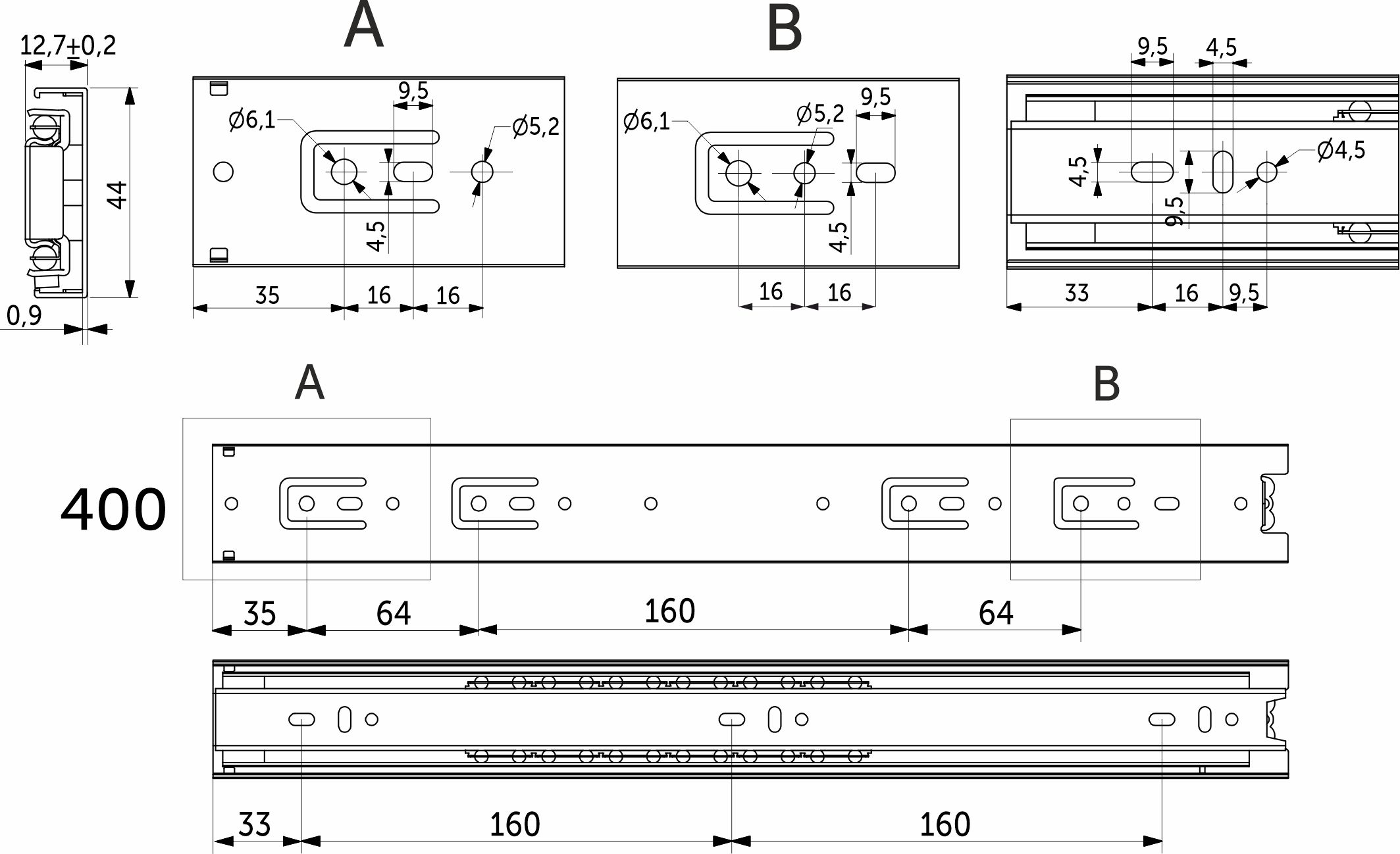 Направляющие высотой 45 мм изготовлены из холоднокатаной стали и имеет толщины 0.9*0.9*1,0, что гарантирует нагрузку до 30 кг и запас прочности в 60000 циклов. Кроме того, имеется резиновый фиксатор от самопроизвольного открытия. Длина — 400 мм