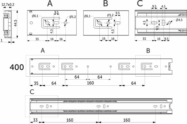 Высота 45 мм. Нагрузка 35 кг. Длина — 400 мм.