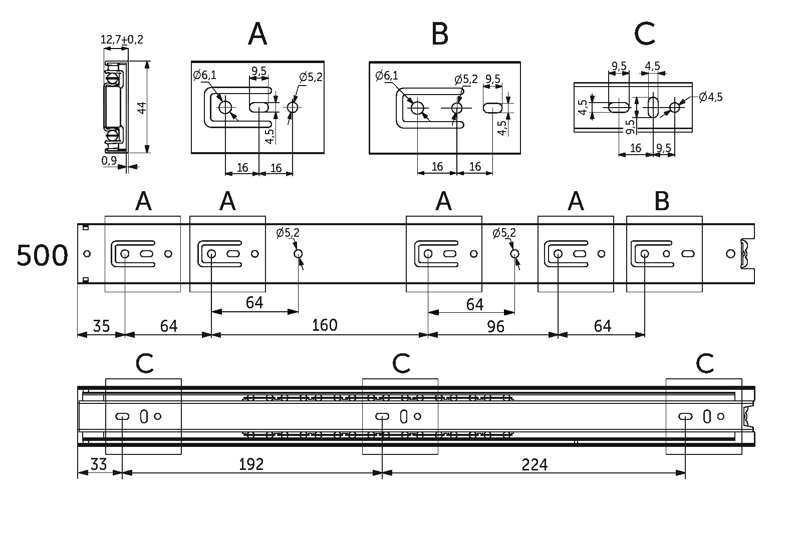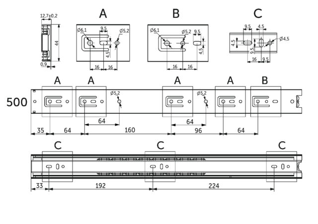 Направляющая для мебели AKS изготовлена из холоднокатаной стали толщиной 0,9*0,9*1,0 мм, имеет резиновый фиксатор от самопроизвольного открытия. Фактическая высота данной направляющей 45 мм, а её длина – 500 мм.
