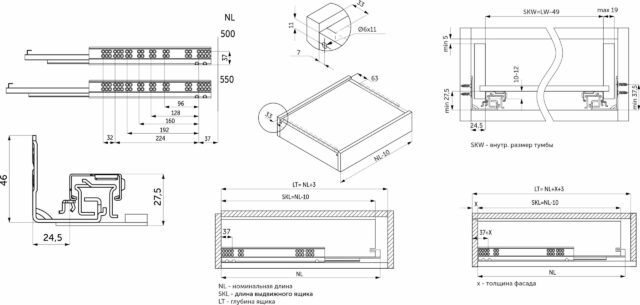 Направляющая скрытого монтажа L-550 с доводчиком ДСП до19mm с замками PRIME 3D полное выдв. 113652