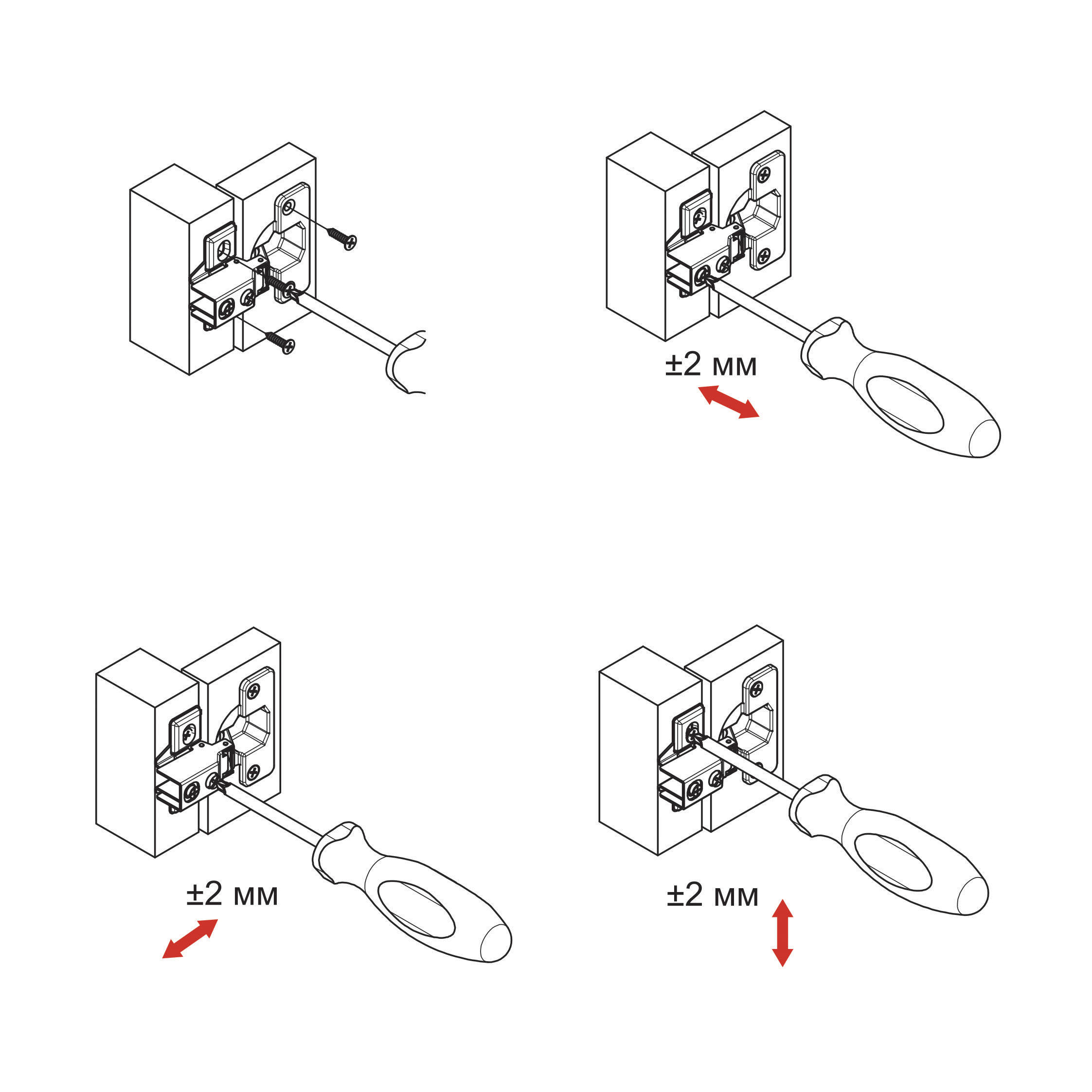Петли данной линейки являются двухходовыми, с возможностью остановки фасада в полуоткрытом положении, имеют угол открывания в 100°.