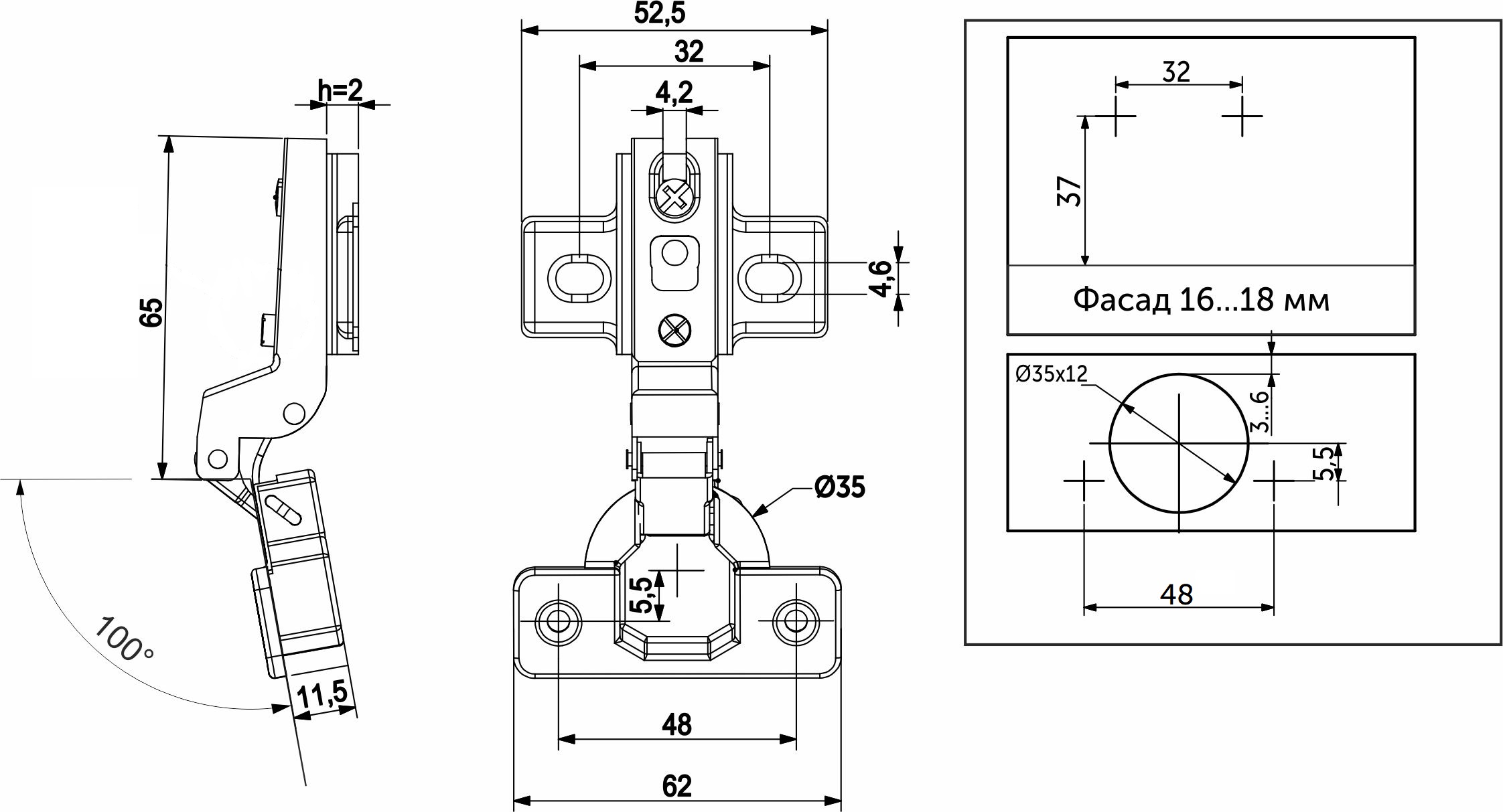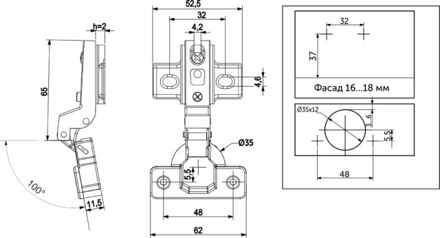 Петля предназначена для фасадов толщиной от 15 до 22 мм, имеет межцентровое расстояние между отверстиями в чашке в 48мм, а также высоту монтажной планки h2.