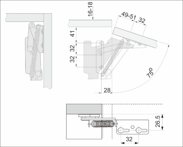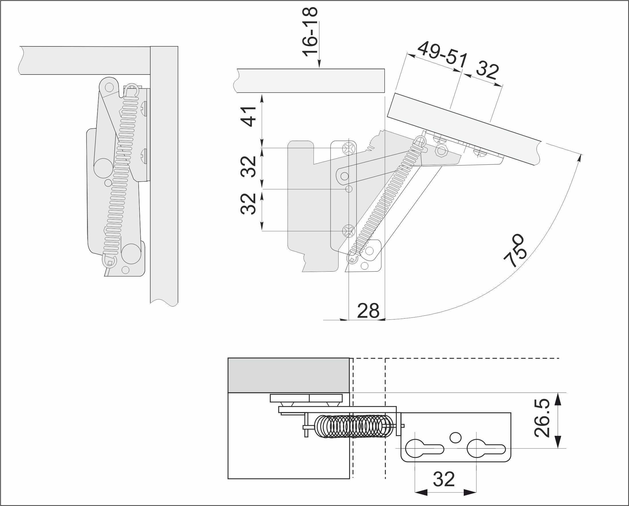 Представляет собой шарнирный механизм с питой пружиной. Не требует установки петель, нет фиксации и регулировки усилий.