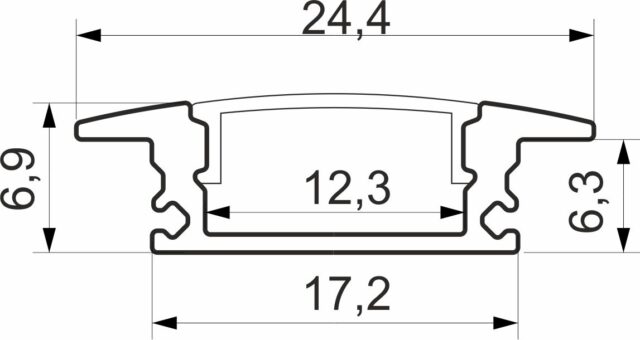 Врезной профиль, ширина части под фрезеровку 17 мм, высота 7 мм, матовый экран, длина 3м., внутренняя часть вмещает ленту шириной до 12 мм.