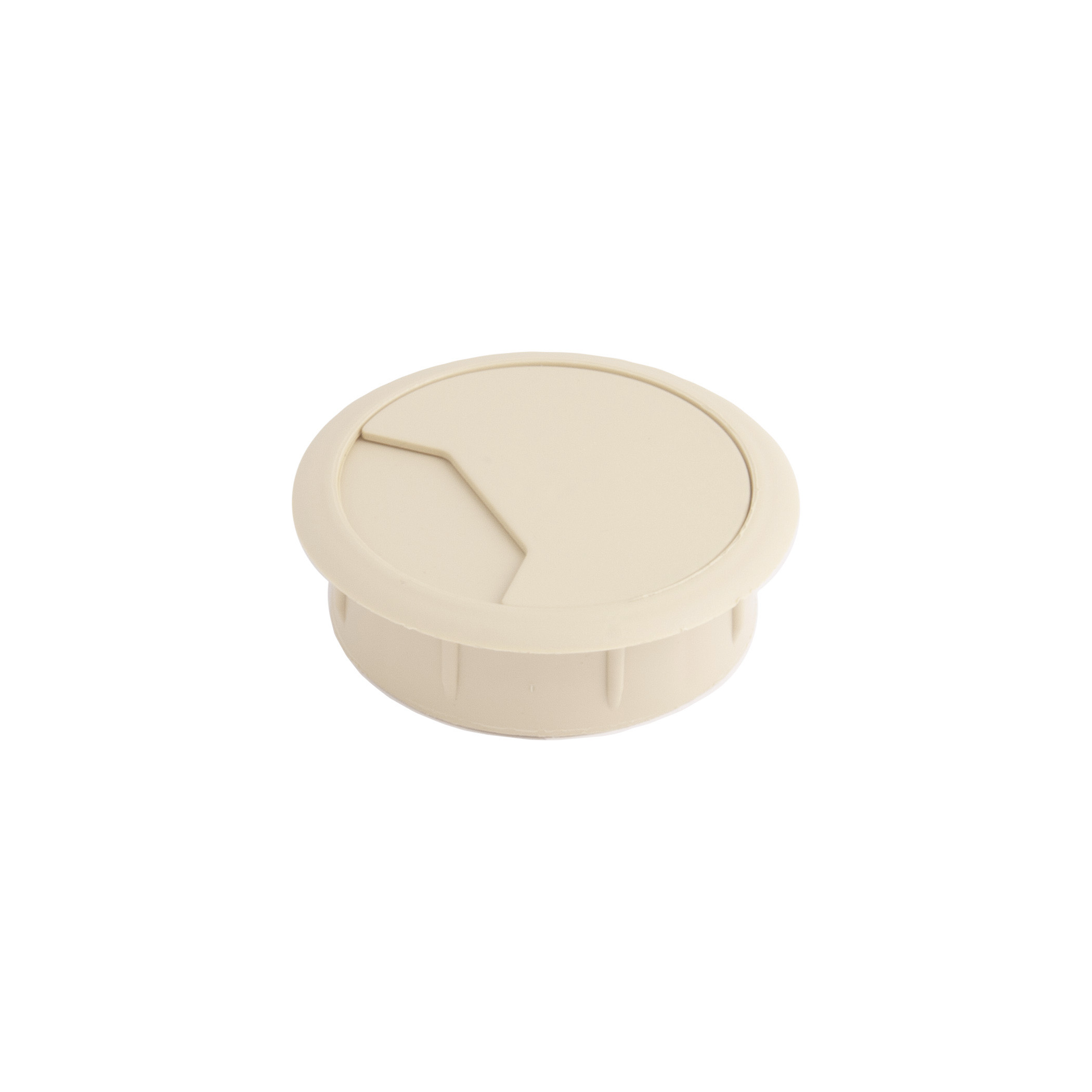 Пропуск кабельный пластиковый врезной. Габаритный диаметр изделия 70мм, размеры отверстия в столешнице — d60мм. Внутри пропуска есть съемная крышка, которая частично либо полностью закрывает отверстие для кабеля.