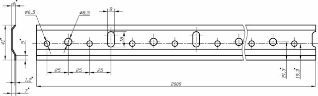Монтажная шина (рейка) для навесов предназначен для крепления ящиков верхнего яруса к стене с помощью различных типов навесов. Стандартная длина шины 2000 мм, но также применяются шины длиной 60, 80 и 100 мм. Шину можно монтировать как целиком, так и разрезая по необходимым размерам. Толщина металла у данной шины может быть 1.0, 1.2, 1.5 и 2,0 мм. Код 70 344 — облегченная