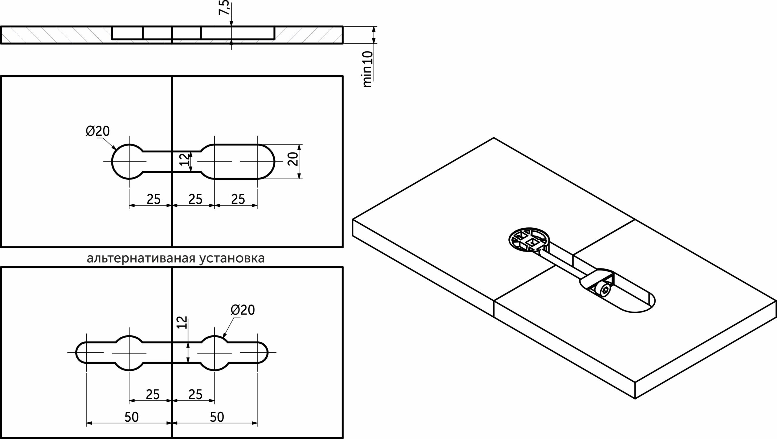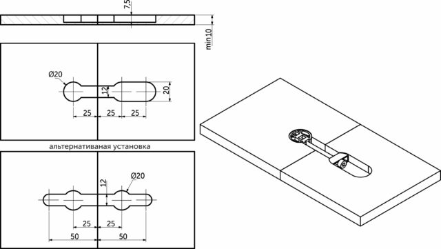 Стяжка для плит, панелей и столешниц толщиной от 10 мм K TOP. Диаметр сверления под корпус стяжки – 20 мм. Стягивание осуществляется с помощью шестигранного ключа 3 мм.