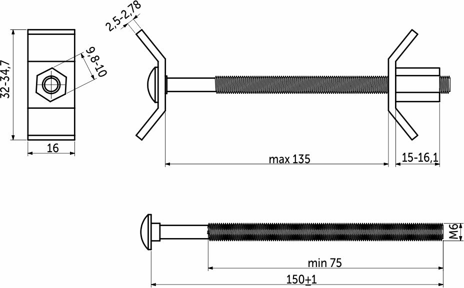 Она состоит из двух С-образных шайб, шпильки с метрической резьбой М6 и удлиненной шестигранной гайки.