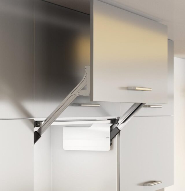 Этот подъемный механизм идеально подходит для верхних шкафов с другими фасадами над ними, а так же для установки в утопленном шкафу, чтобы скрыть, например, электроприборы.