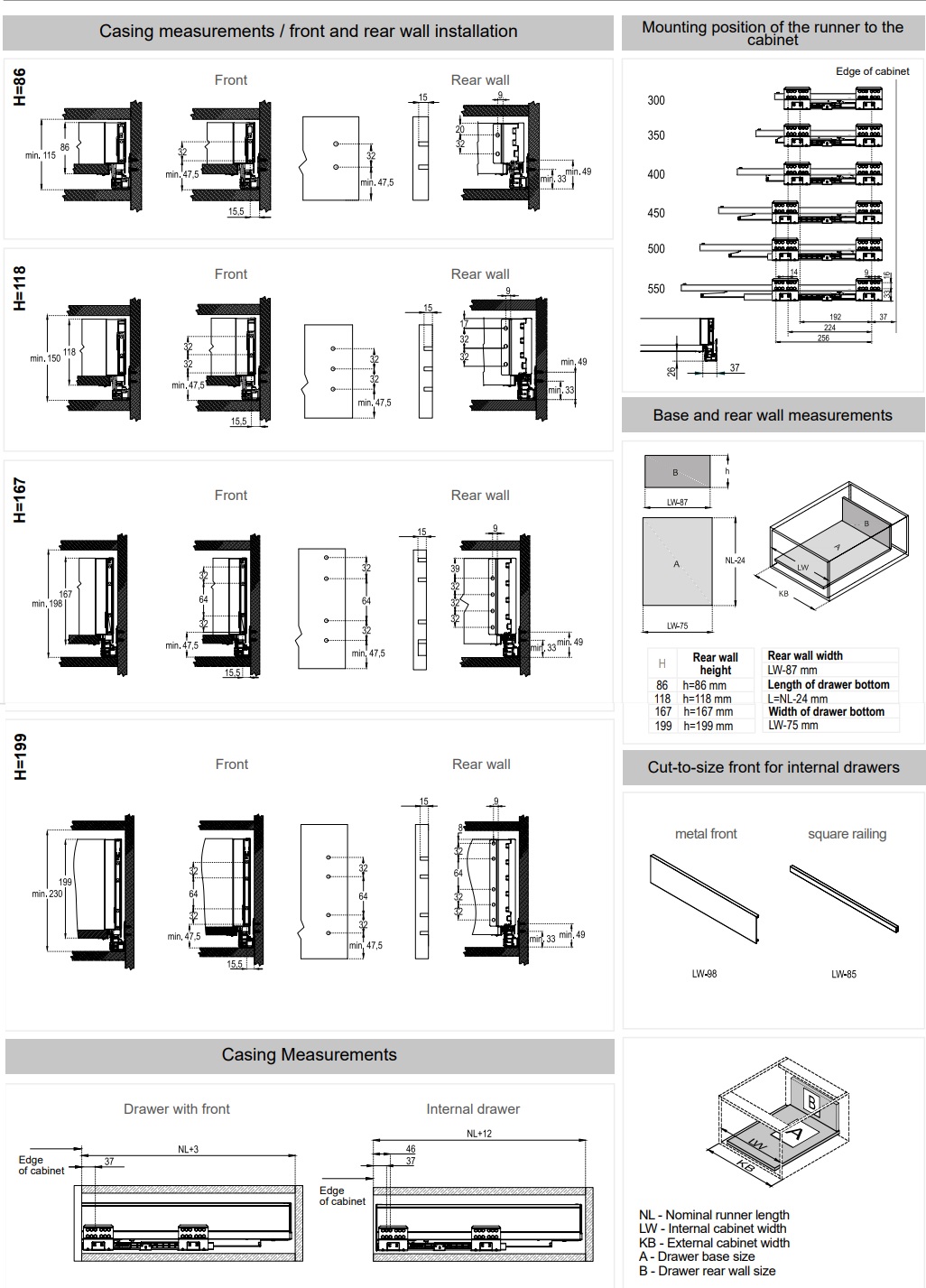 высота боковины ящика H=167 мм прямая боковина внутри и снаружи длина направляющей 300-550 мм нагрузка 40 кг быстрый монтаж полное выдвижение направляющая с плавным закрыванием и синхронизацией протес...