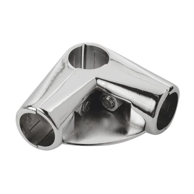 UNO 006 угловой соединитель 3-х труб с одной полкой — крепежный элемент, используемый при сборке торгового оборудования. Представляет собой угловой зажим трех труб диаметром 25 мм, с площадкой для установки деревянной или стеклянной полки.