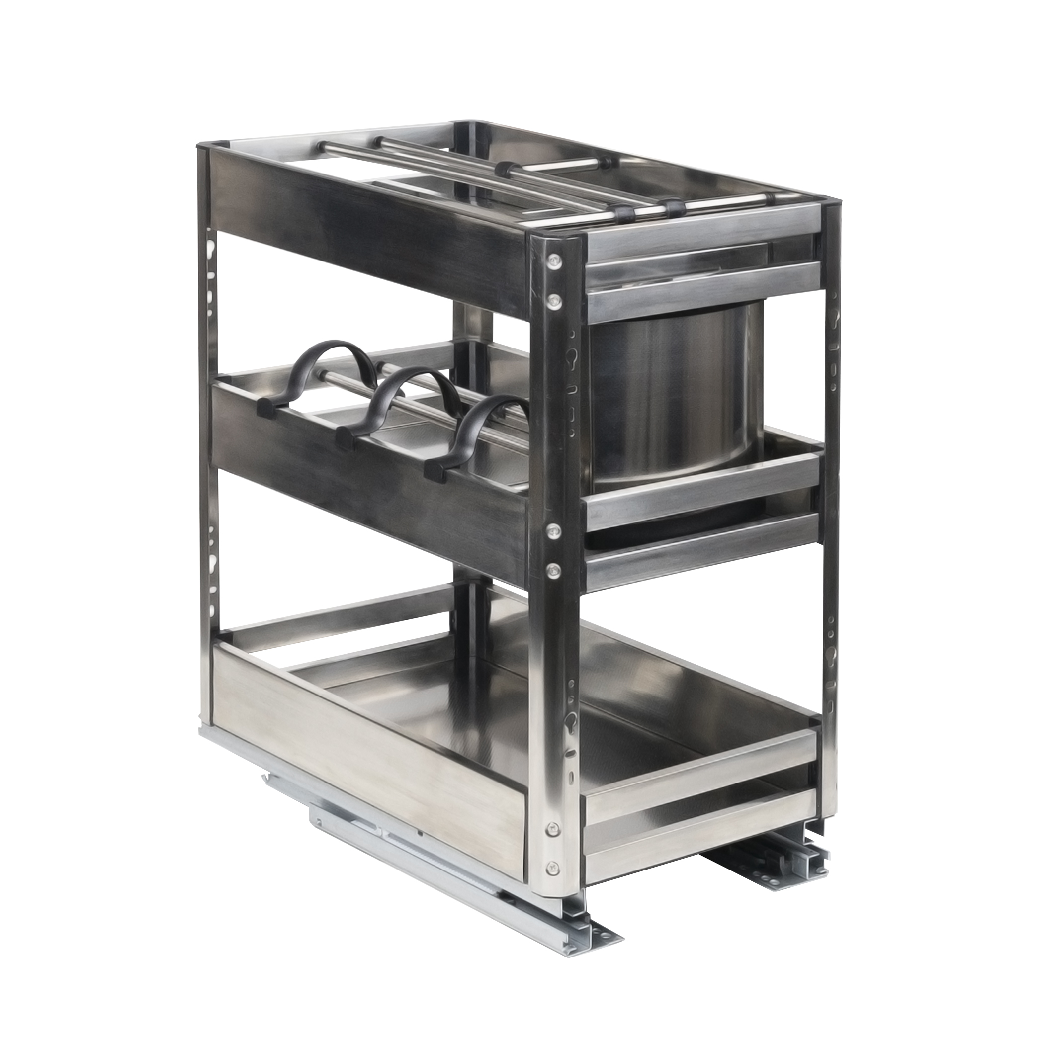 Трехуровневое карго изготовлено из листовой нержавеющей стали. В комплект входят направляющие скрытого монтажа с доводчиком. Верхний уровень представляет собой полочку с подставками-лотками для столовых приборов, ножей и прочих кухонных приспособлений. Средний уровень оснащен разделителями, что очень удобно для хранения бутылок — при выдвижении они не будут ездить по карго. На нижнем уровне удобно располагать невысокие баночки и другие емкости.