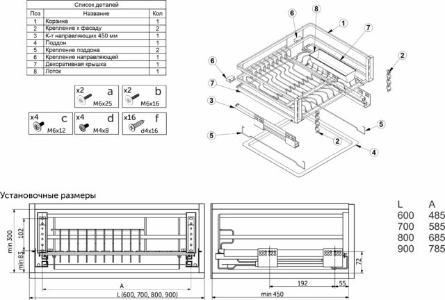 Корзина изготовлена из нержавеющей стали, плоский прут, направляющие скрытого монтажа с доводчиком, крепление к фасаду с 3D-регулировкой. В комплект входит пластиковый поддон и пластиковый вкладыш для столовых приборов. декоративные защитные планки для направляющих.