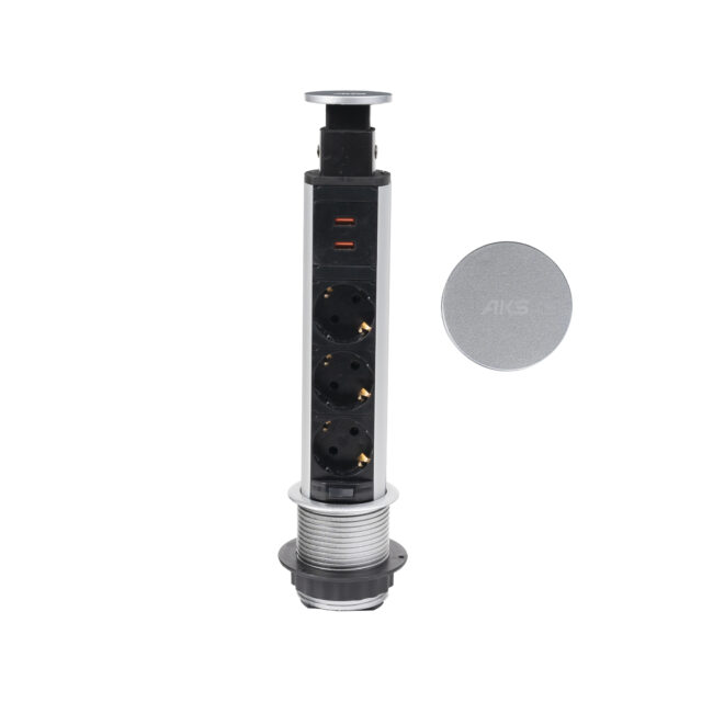 Выдвижной удлинитель, 60 мм 3 розетки (Schuko) +2 USB, цвет алюминий, тип розеток Schuko, входное напряжение 220В, выходное напряжение 220В, максимальная сила тока 16А, USB выходное напряжение 5В сила тока 2.4А, максимальная мощность 12Вт, длина шнура 1,8м.