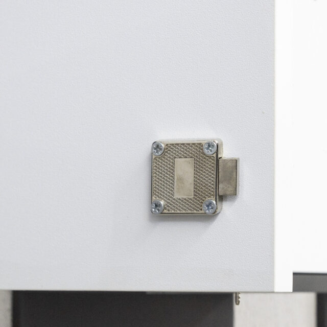 Данная модель является наиболее популярной среди мебельных замков. Замок предназначен для деревянных, ЛДСП, МДФ — фасадов толщиной 16-18 мм. Для монтажа данного типа замков необходимо высверлить отверстие для личинки цилиндра, сам же корпус замка крепится саморезами с обратной стороны фасада. С лицевой стороны фасада к замку монтируется декоративная накладка.